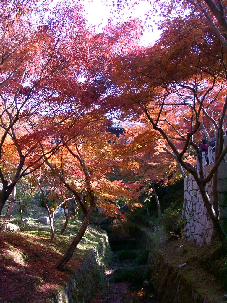 庭へ降りていった。紅葉の木の並ぶ庭を歩いて、通天橋の下のほうを