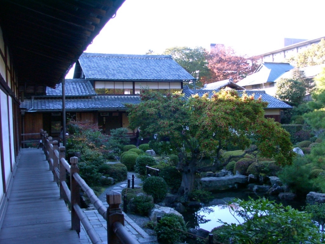 廊下を渡り、右側に上っていくと、庭、池、建物が・・・