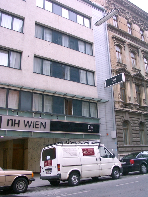 シュティフト通りを右へ。 左上にシュティフト教会 の塔が見えた |